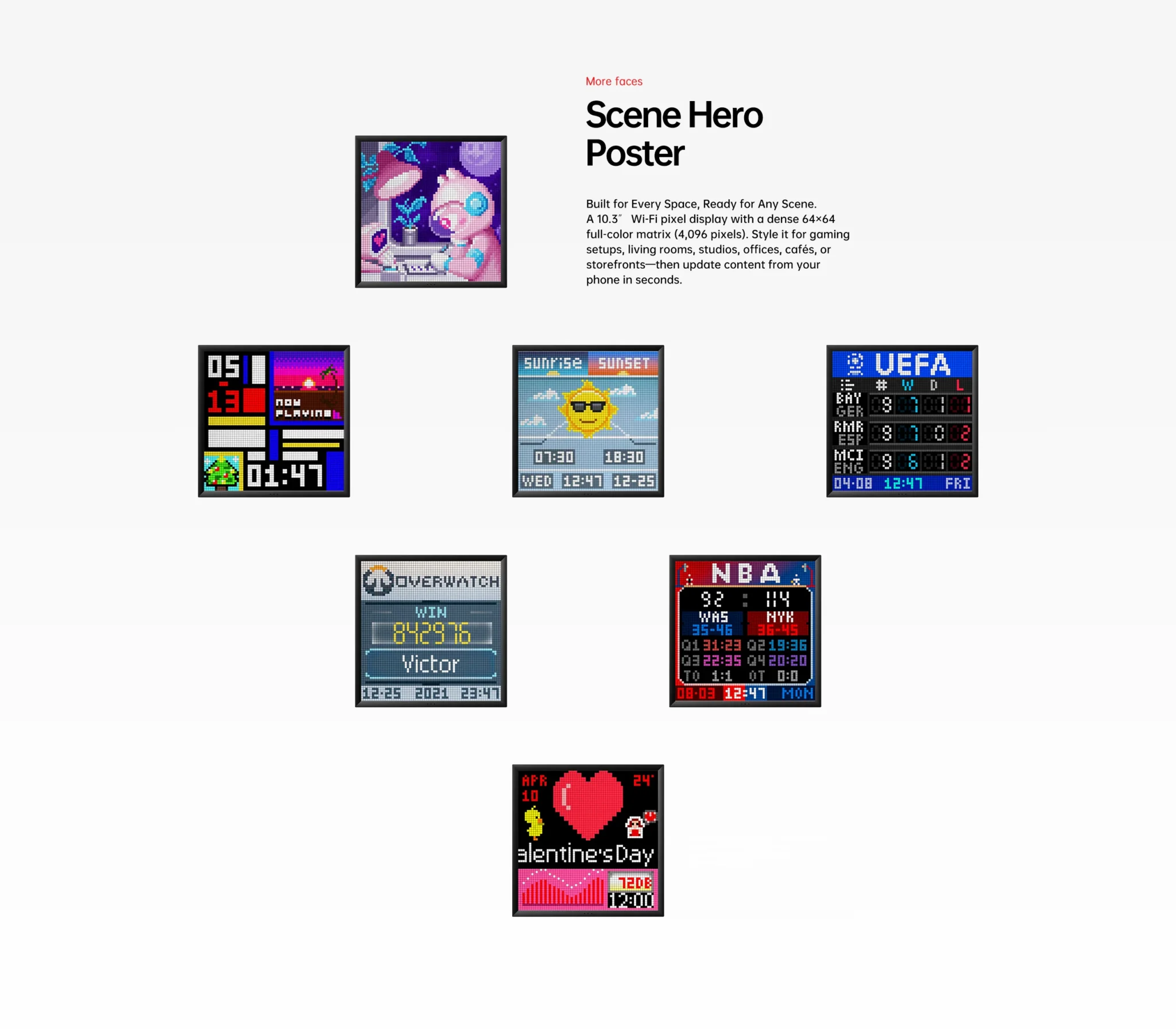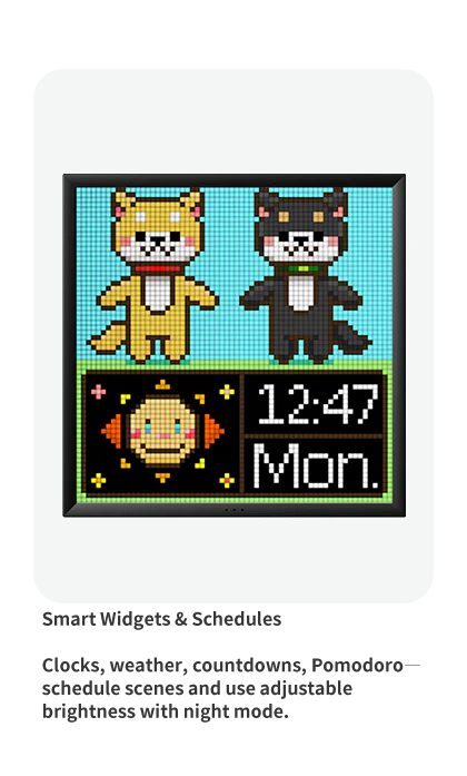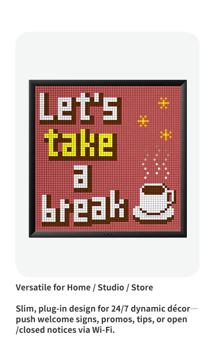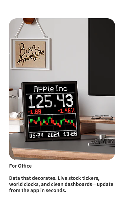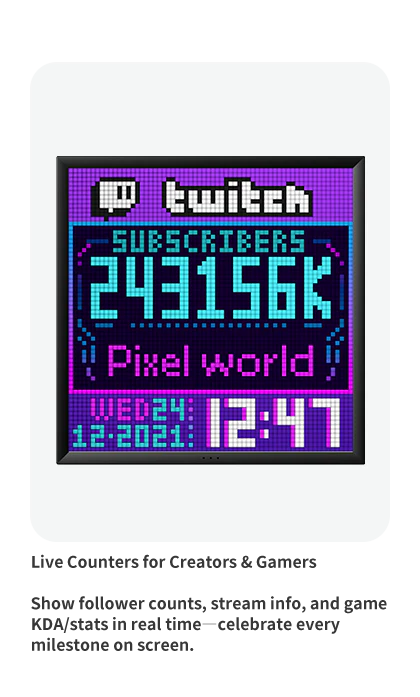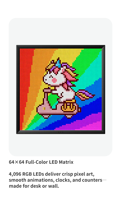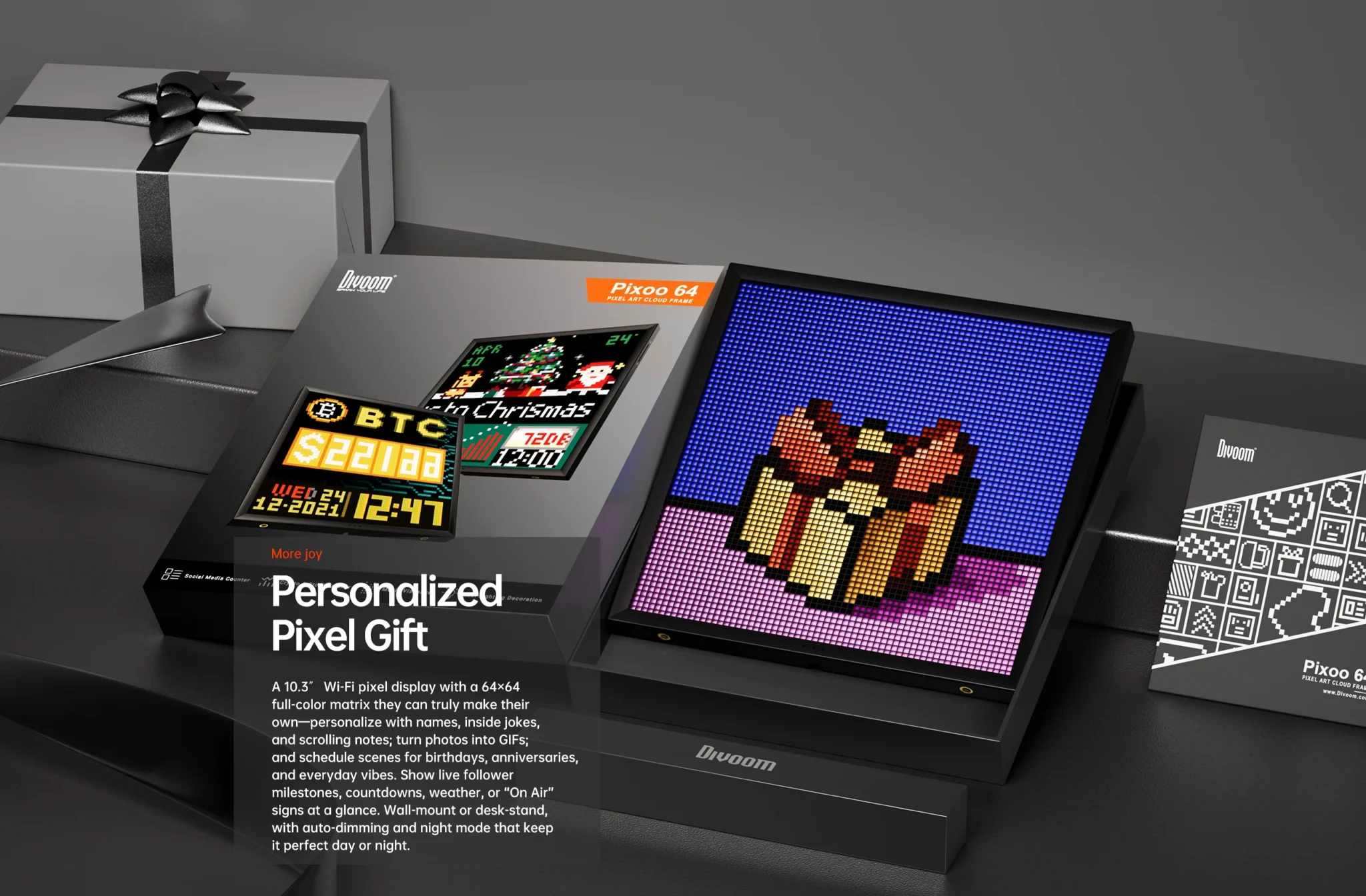 The world’s first WiFi-enabled pixel art display, granting you instant access to the massive Divoom art community and live financial or social trackers on a vibrant 64×64 10.3″ LED canvas.