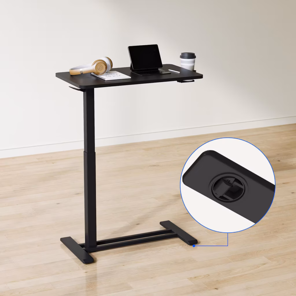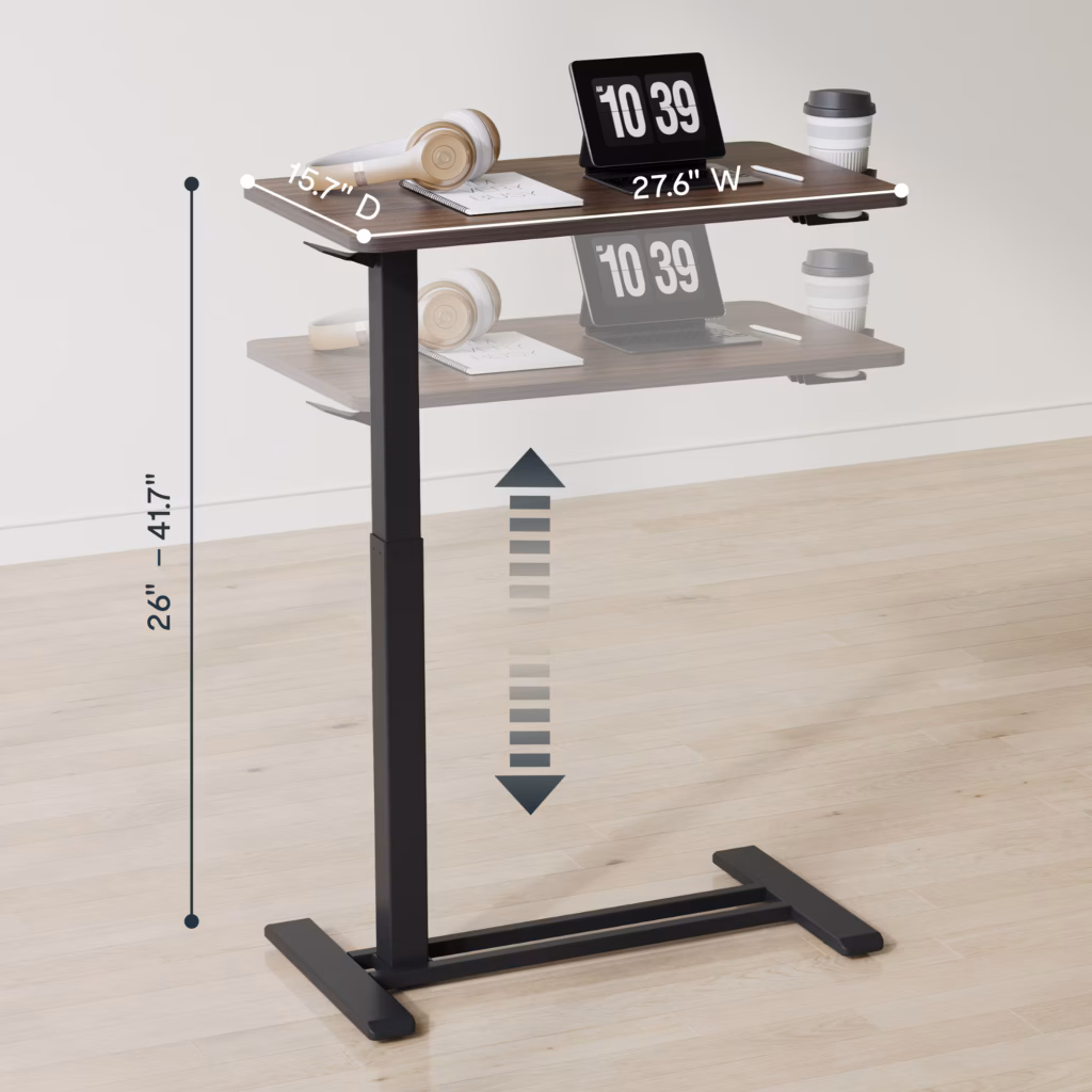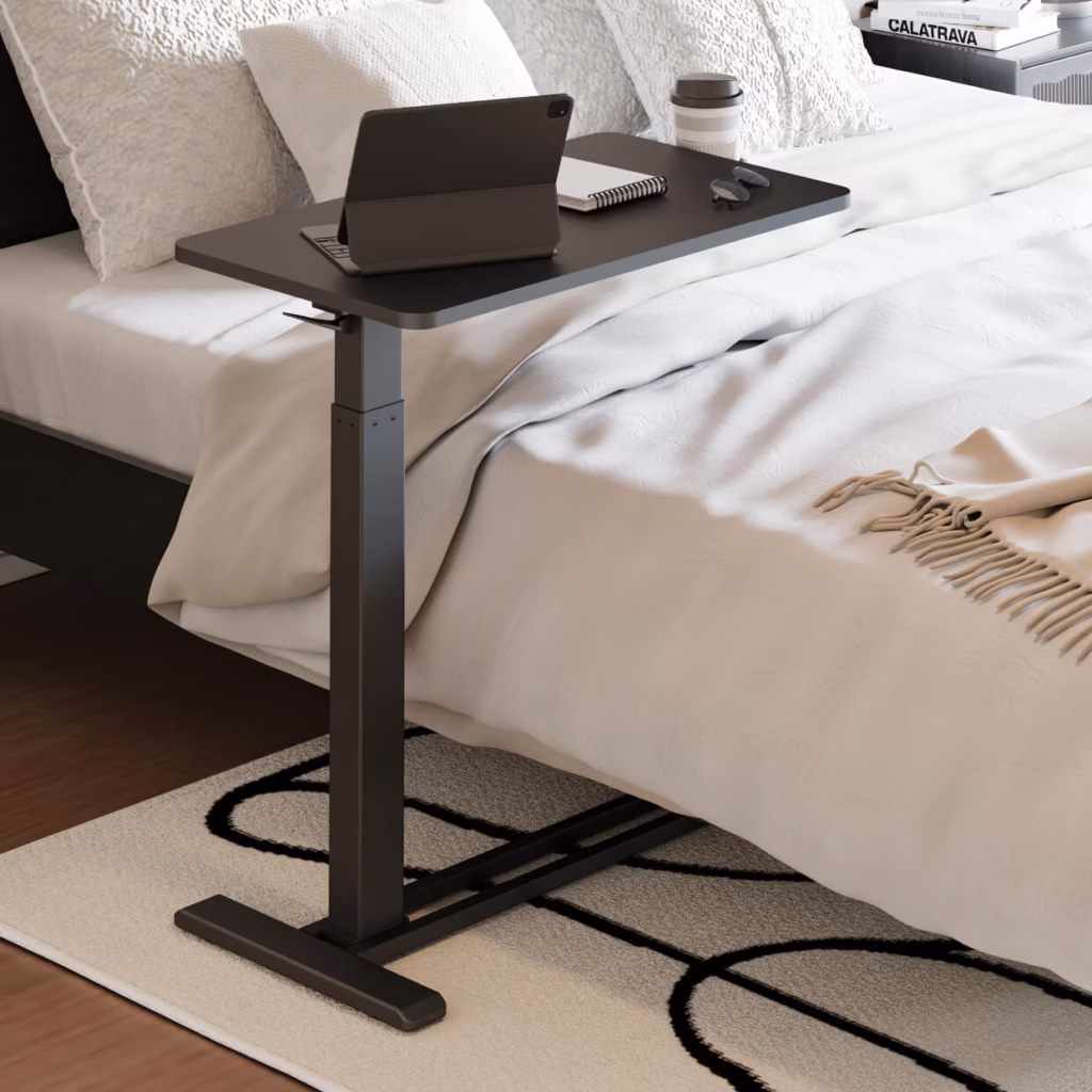 The FlexiSpot H7 is a mobile, C-shaped overbed table featuring a one-hand gas spring pneumatic lift for smooth height adjustment from 26″ to 41.8″, a 27.6″ x 15.8″ engineered wood desktop with a 15.4 lb capacity and integrated cup holder, all supported by a low-profile steel frame with four hidden casters.