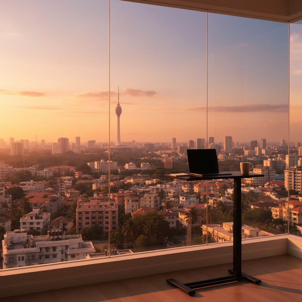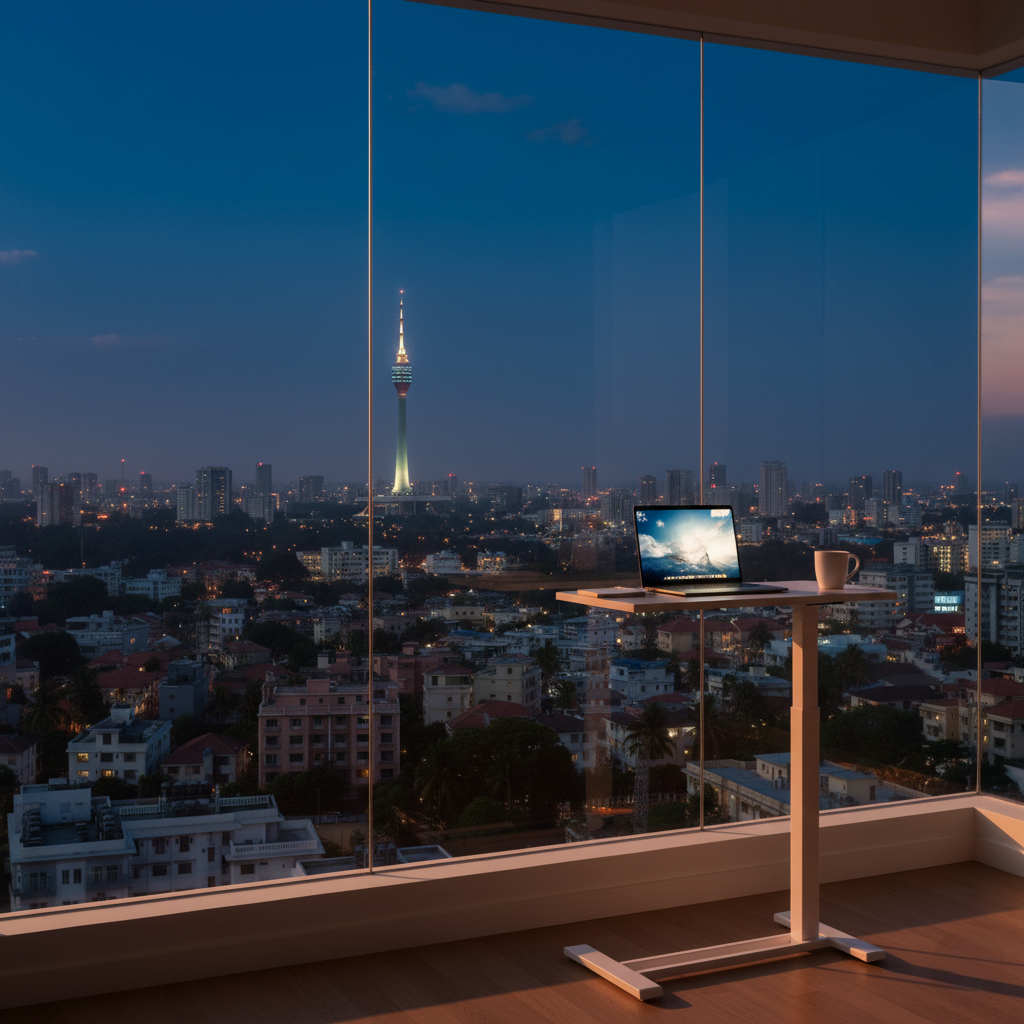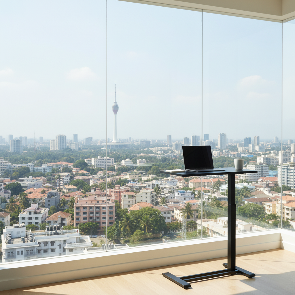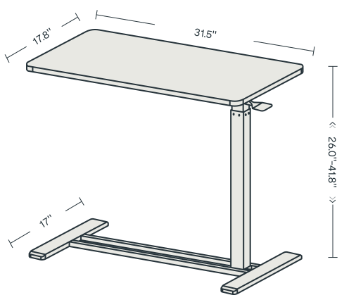 The FlexiSpot H7 is a mobile, C-shaped overbed table featuring a one-hand gas spring pneumatic lift for smooth height adjustment from 26″ to 41.8″, a 27.6″ x 15.8″ engineered wood desktop with a 15.4 lb capacity and integrated cup holder, all supported by a low-profile steel frame with four hidden casters.