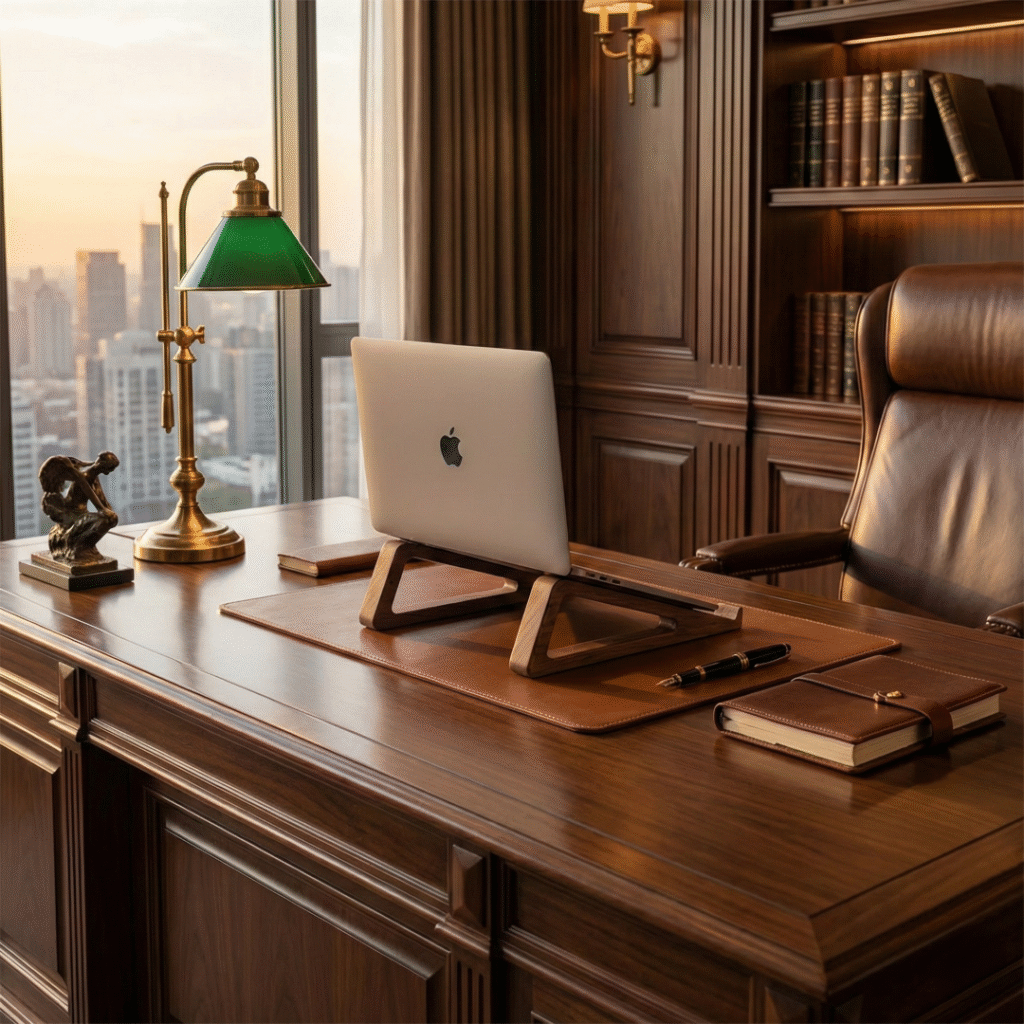 Premium two-piece stand crafted from solid walnut wood for a sophisticated and ergonomic workspace