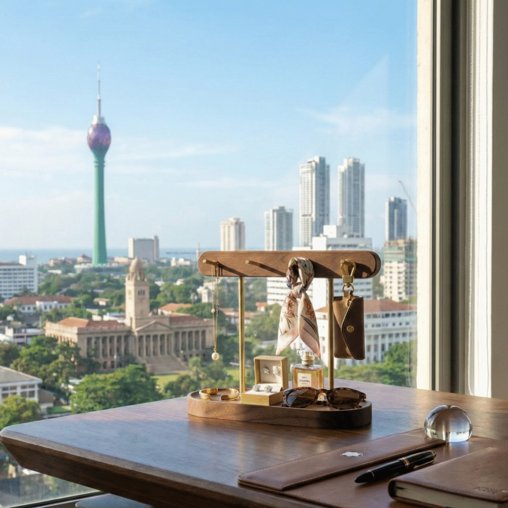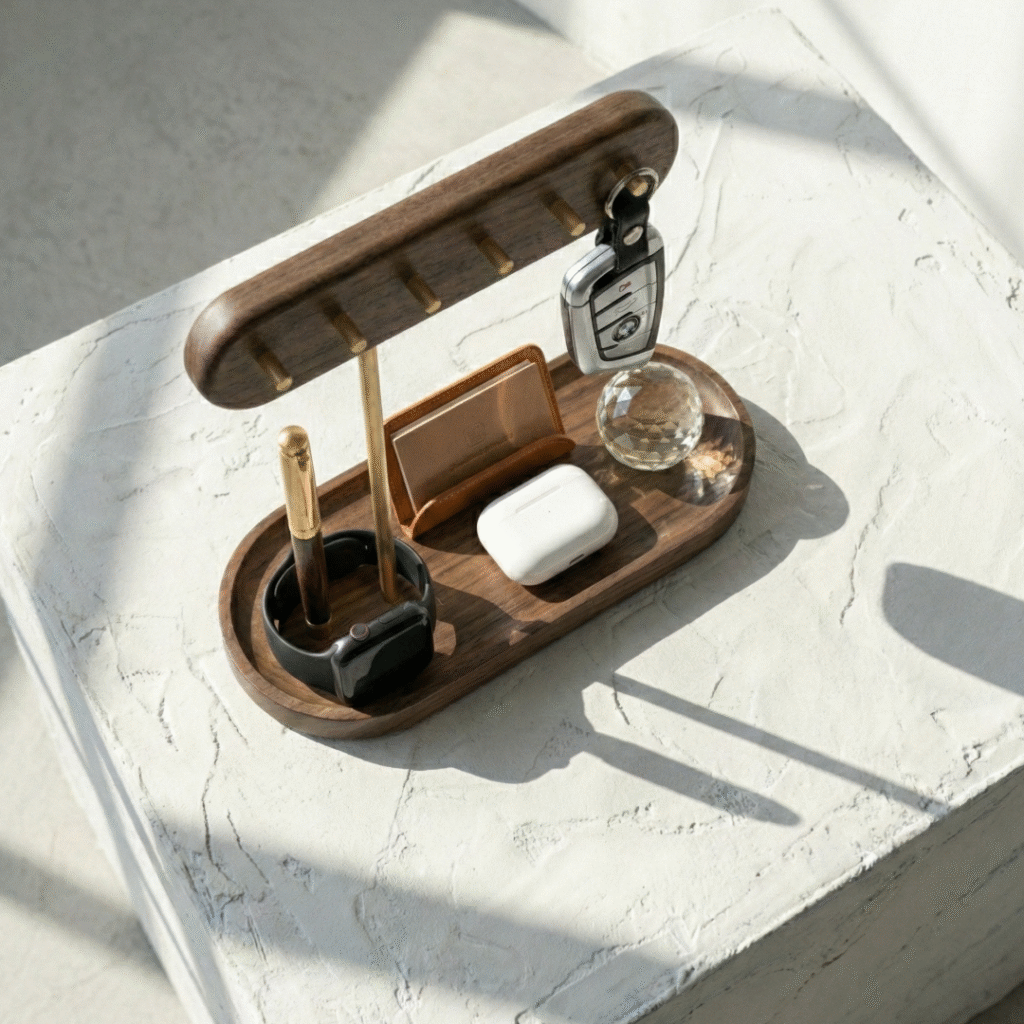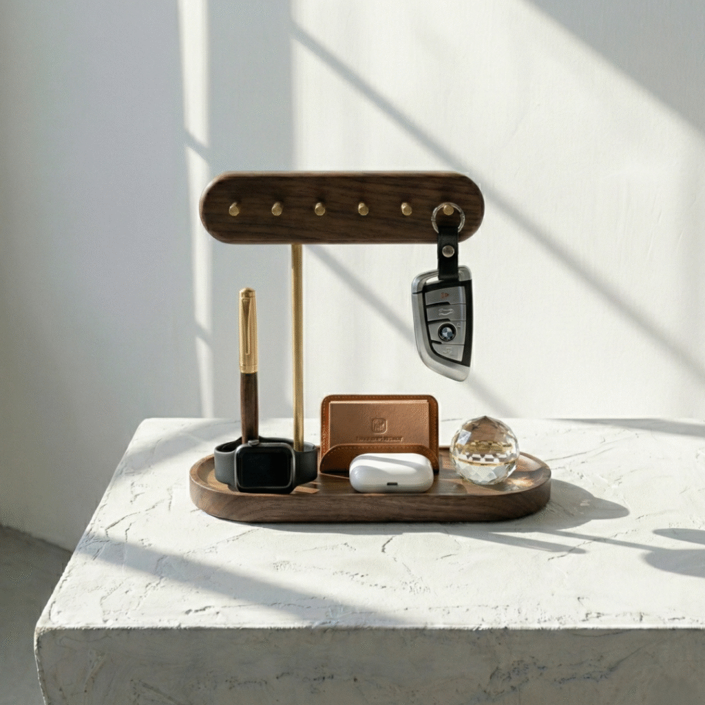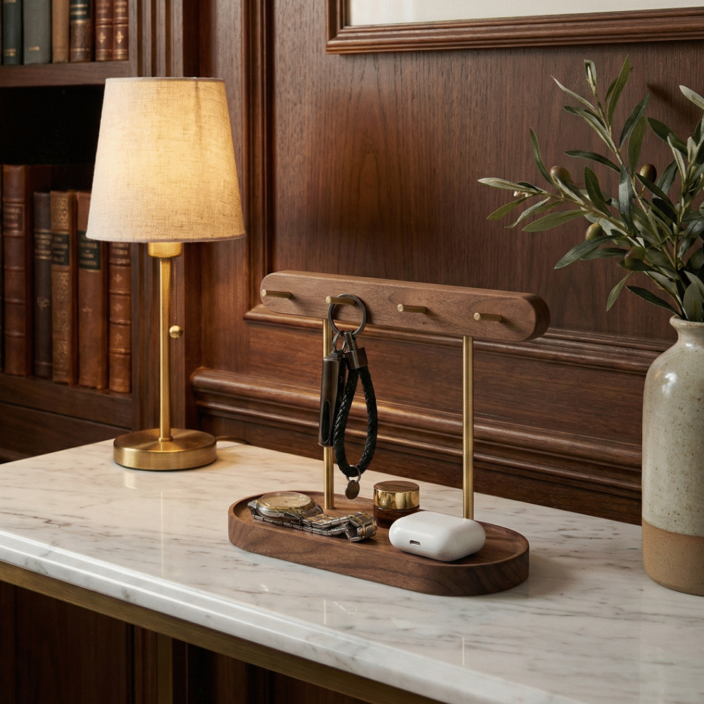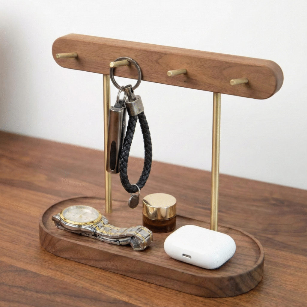 Elevate your daily carry with this solid walnut and brass valet stand, designed with an angled bar and catch-all tray for effortless elegance