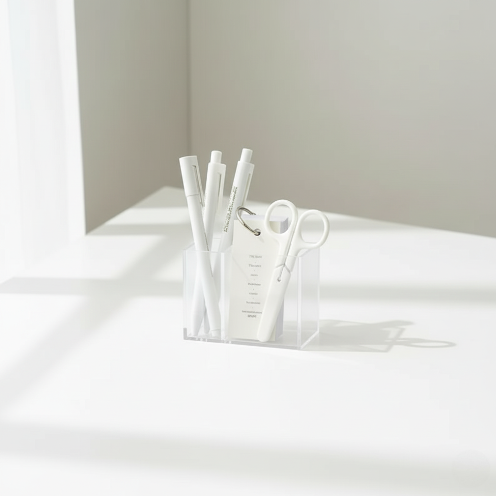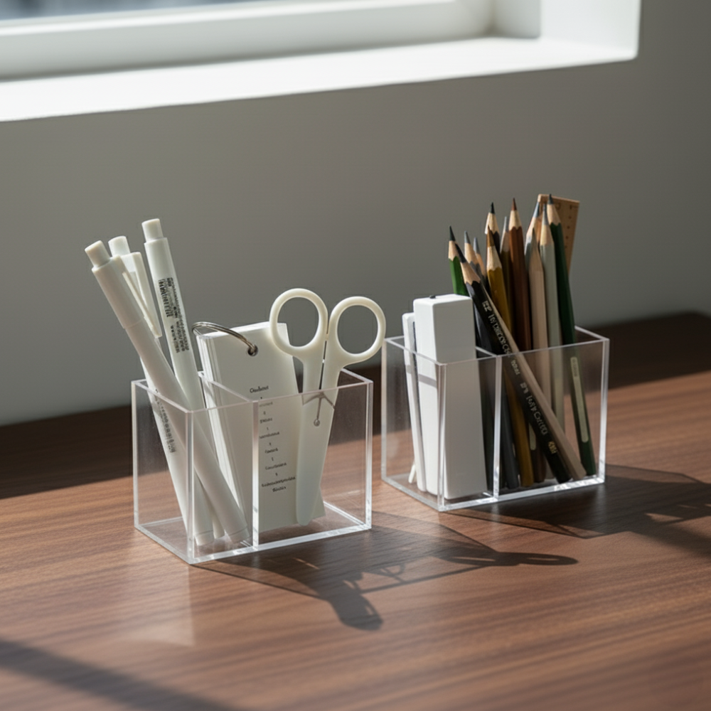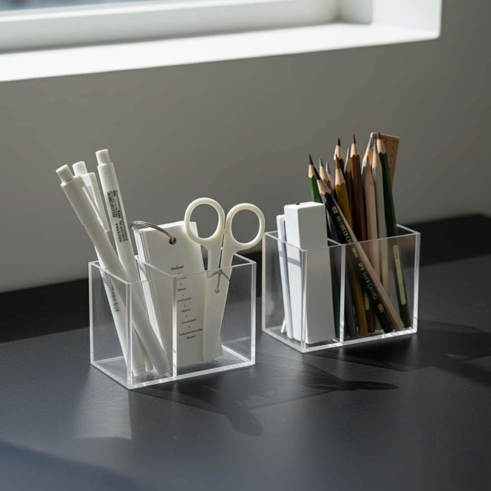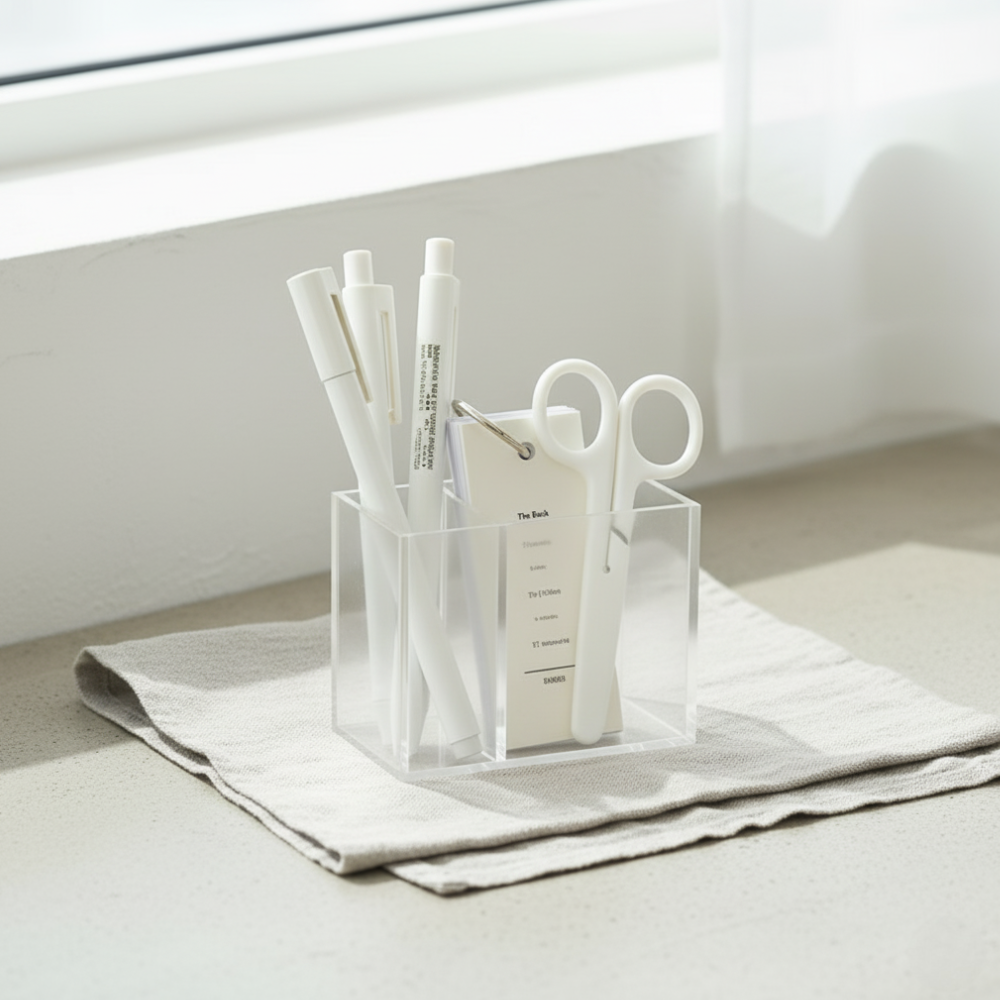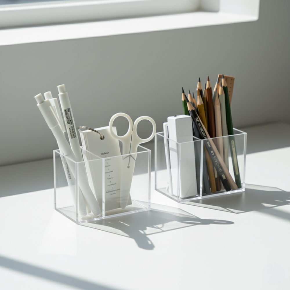 Bring visual peace to your desk with the Clarity. Made from transparent acrylic, this organizer keeps every tool visible and accessible, eliminating the clutter that slows you down. Featuring multiple divided compartments, it’s the perfect solution for sorting pens, scissors, flashcards, and tech accessories. A simple, modern design for a seamlessly clear workspace.