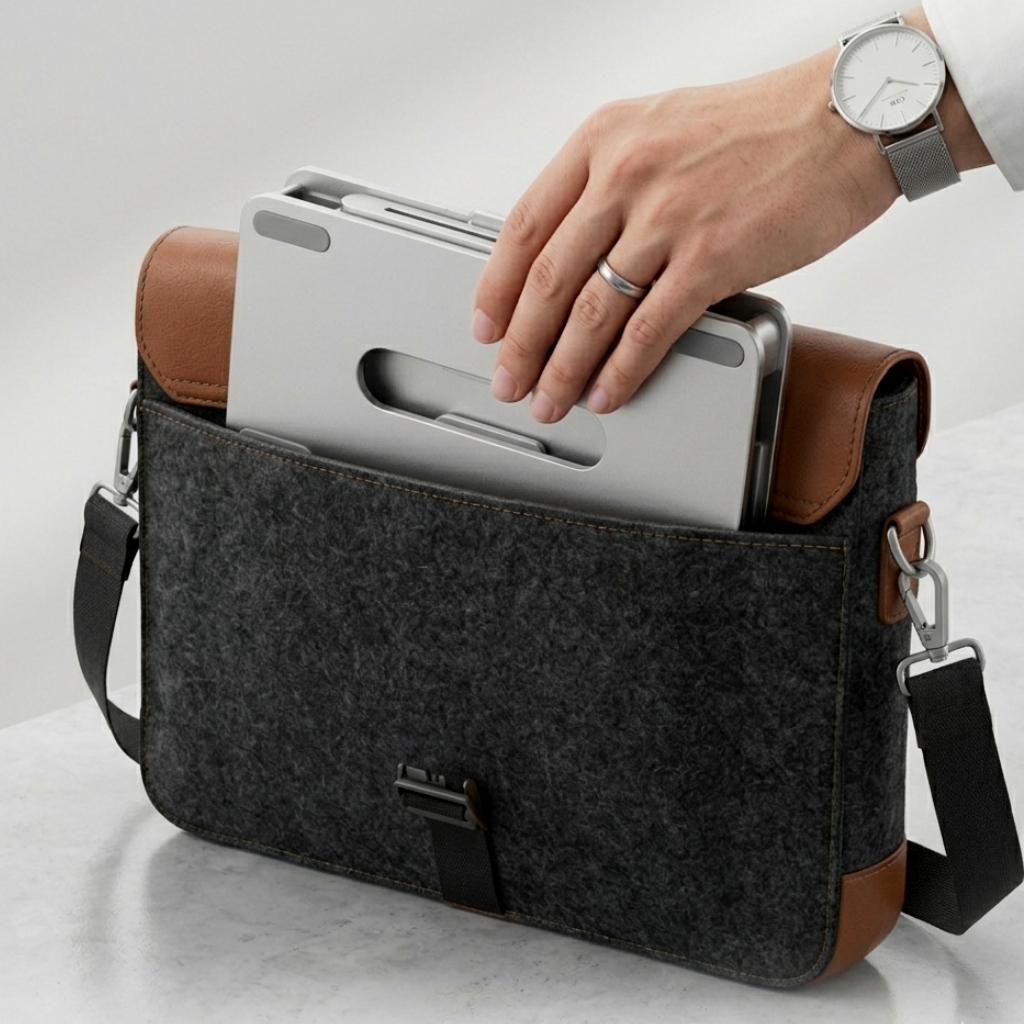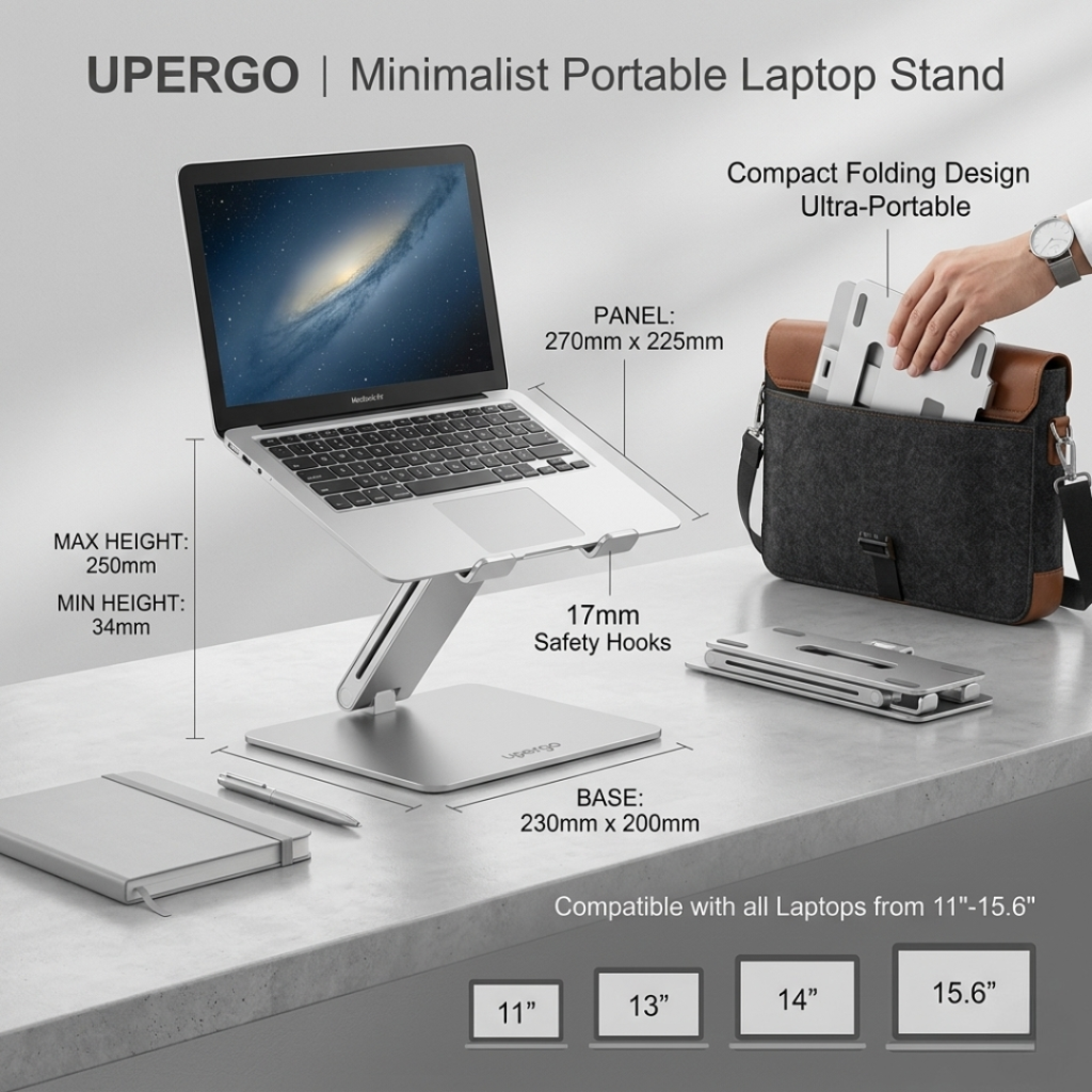 Professional comfort that fits in your bag. This ultra-compact aluminum stand folds completely flat in seconds, making it the perfect travel companion for your laptop.